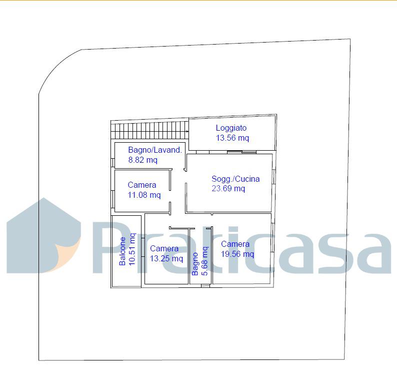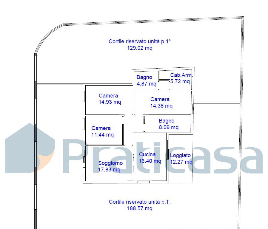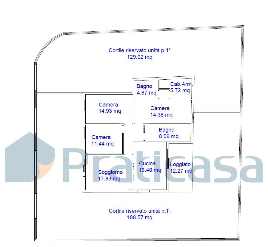 Il primo piano è dotato di un cortile riservato di circa 130 mq, loggiato, soggiorno con cucina open space, tre camere da letto, due bagni (di cui uno adibito a lavanderia) e balcone.