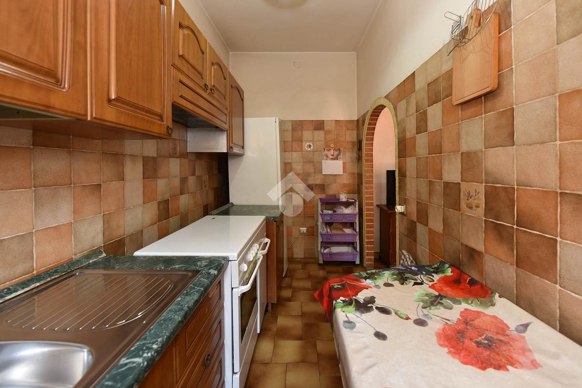 Sulla sinistra troviamo la zona giorno, composta da soggiorno luminoso con cucina semiseparata. Una portafinestra collega l’area living alla pertinenza esterna frontale, ampliando lo spazio fruibile durante la bella stagione.