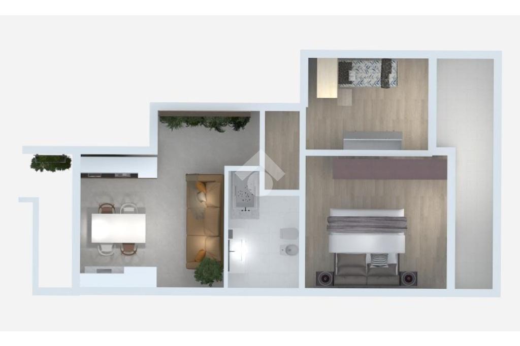 L’ingresso si apre su una zona giorno con angolo cottura, arricchita da un balcone verandato che offre uno spazio aggiuntivo perfetto per essere sfruttato tutto l’anno.